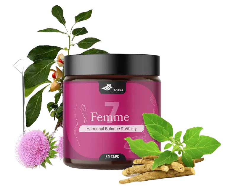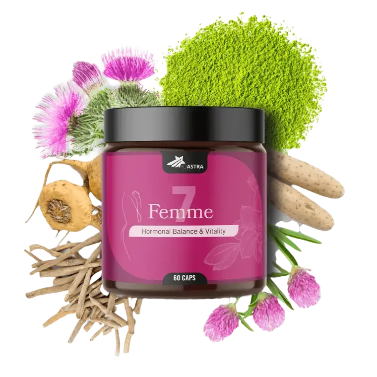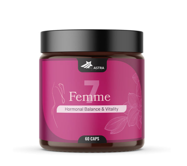 Το Femme 7 είναι ένα φυσικό συμπλήρωμα διατροφής που έχει σχεδιαστεί για τη ρύθμιση του ορμονικού ισοζυγίου στις γυναίκες και για την υποστήριξη σε σημεία που σχετίζονται με ορμονικές διακυμάνσεις, περιεμμηνόπαυση και εμμηνόπαυση. Το προϊόν απευθύνεται σε γυναίκες που αντιμετωπίζουν συμπτώματα που σχετίζονται με ορμονικές αλλαγές, όπως αλλαγές στη διάθεση, στρες, νευρικότητα, αίσθημα ανισορροπίας, υποστήριξη ύπνου και άλλα συμπτώματα.